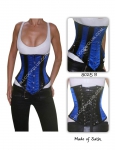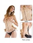 Made by satin,mesh fabrics, Stain less steel front busc and laces, Stain less steel bones and spiral in side the corset, white brass eyelets back to the corset, polyster laces, 100 % cotton jean lining.