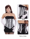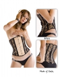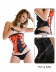 Made by satin fabrics, Stain less steel front busc and laces, Stain less steel bones and spiral in side the corset, white brass eyelets back to the corset, polyster laces, 100 % cotton jean lining.